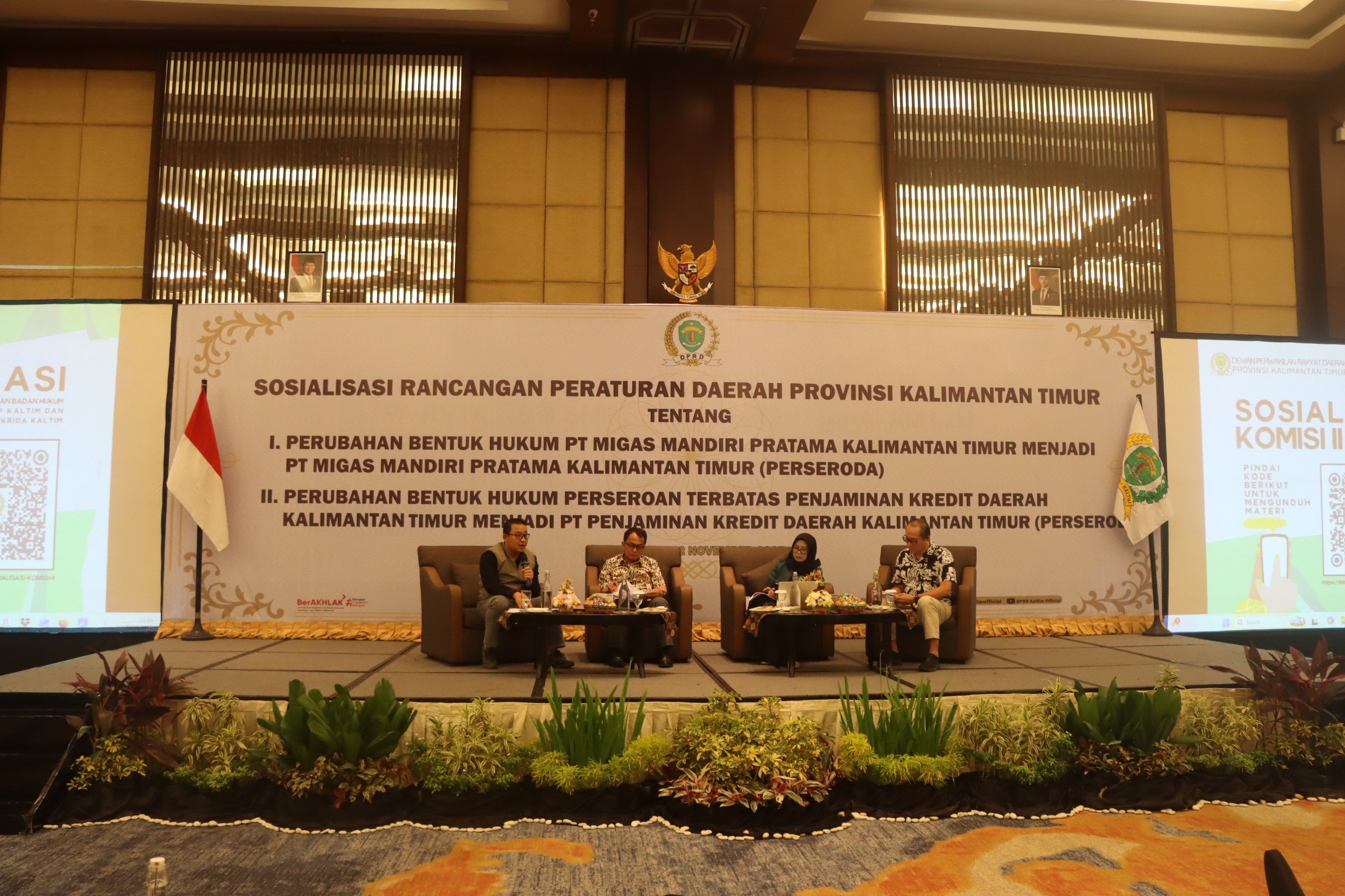 Sosialisasi menghadirkan narasumber Sapto Setyo Pramono, Asisten II Bidang Perekonomian dan Administrasi Pembangunan Kaltim Ujang Rachmad, Kepala Biro Hukum Kaltim Suparmi, dengan moderator Staf Ahli DPRD Kaltim Eko Priyono.